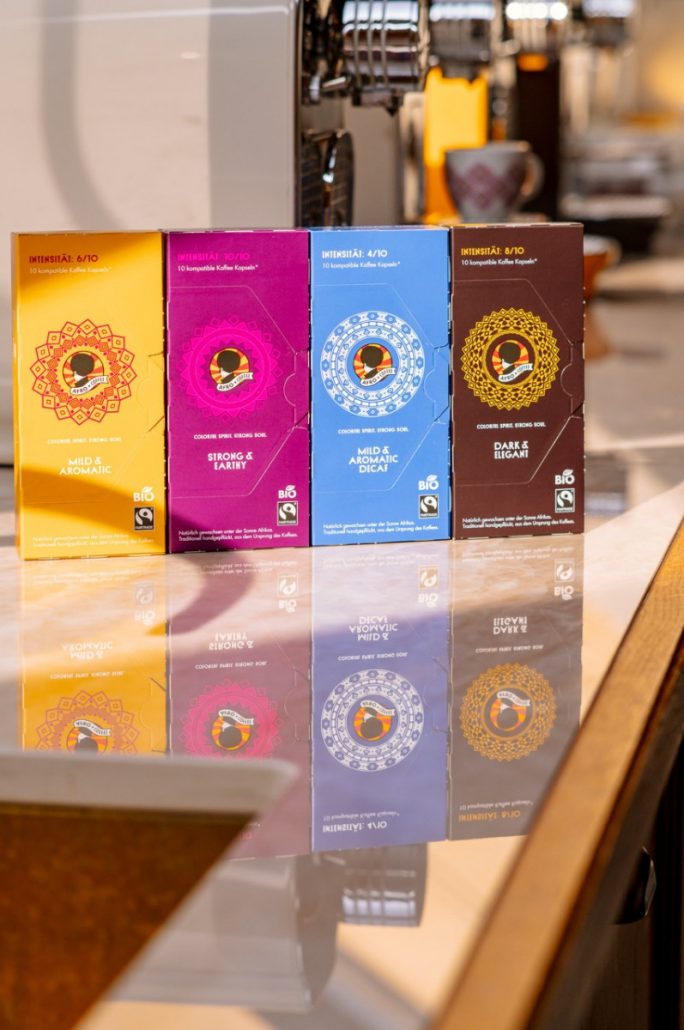 Die farbenfrohen Ornamente auf den Verpackungen stammen von der äthiopischen Künstlerin Zion Yaynu, inspiriert von den traditionellen Mustern der Region Oromia. Damit wird jede Packung zum kleinen Kunstwerk – eine Hommage an die kulturelle Herkunft des Kaffees.